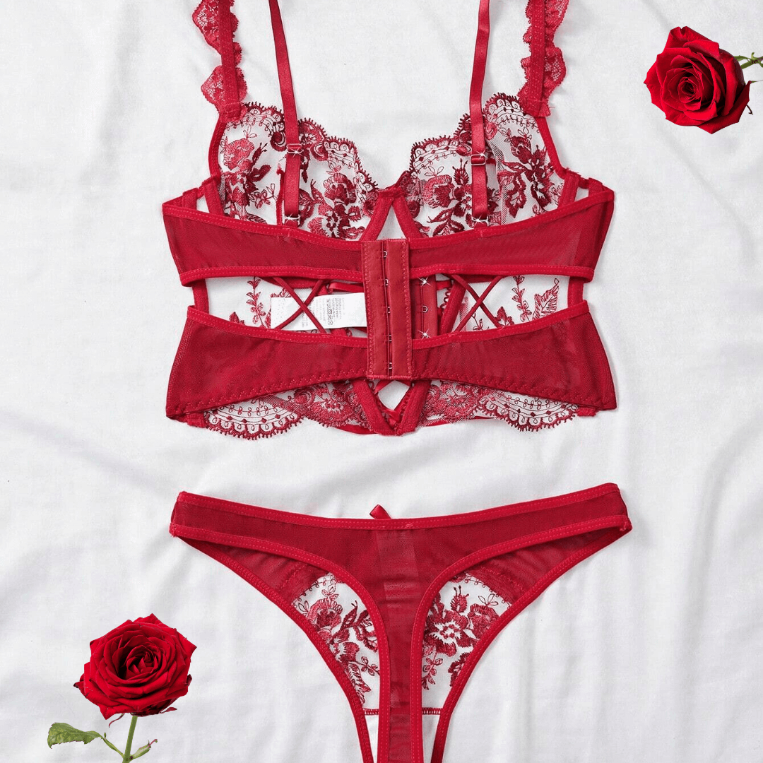 A bold red lace lingerie set featuring an underwired embroidered bra and matching sheer thong. Bold, powerful, and designed to enhance your natural curves.